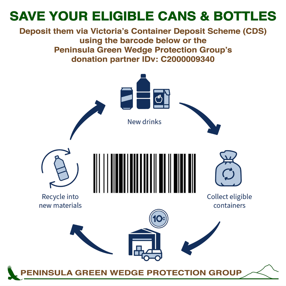 Victoria has a Container Deposit Scheme (CDS) which provides a 10 cent refund per container for recycling eligible cans and bottles. You can support the Green Wedge in 3 ways - by keeping our landscape tidy, disposing of rubbish responsibly and directing the CDS refund to the Peninsula Green Wedge Protection Group Bendigo Bank account. 100% of your refund to our non-profit group will be used to protect the Green Wedge.Don't underestimate the collective value of 10 cent refunds. Our sister branches have raised $1000s by collecting cans and bottles!